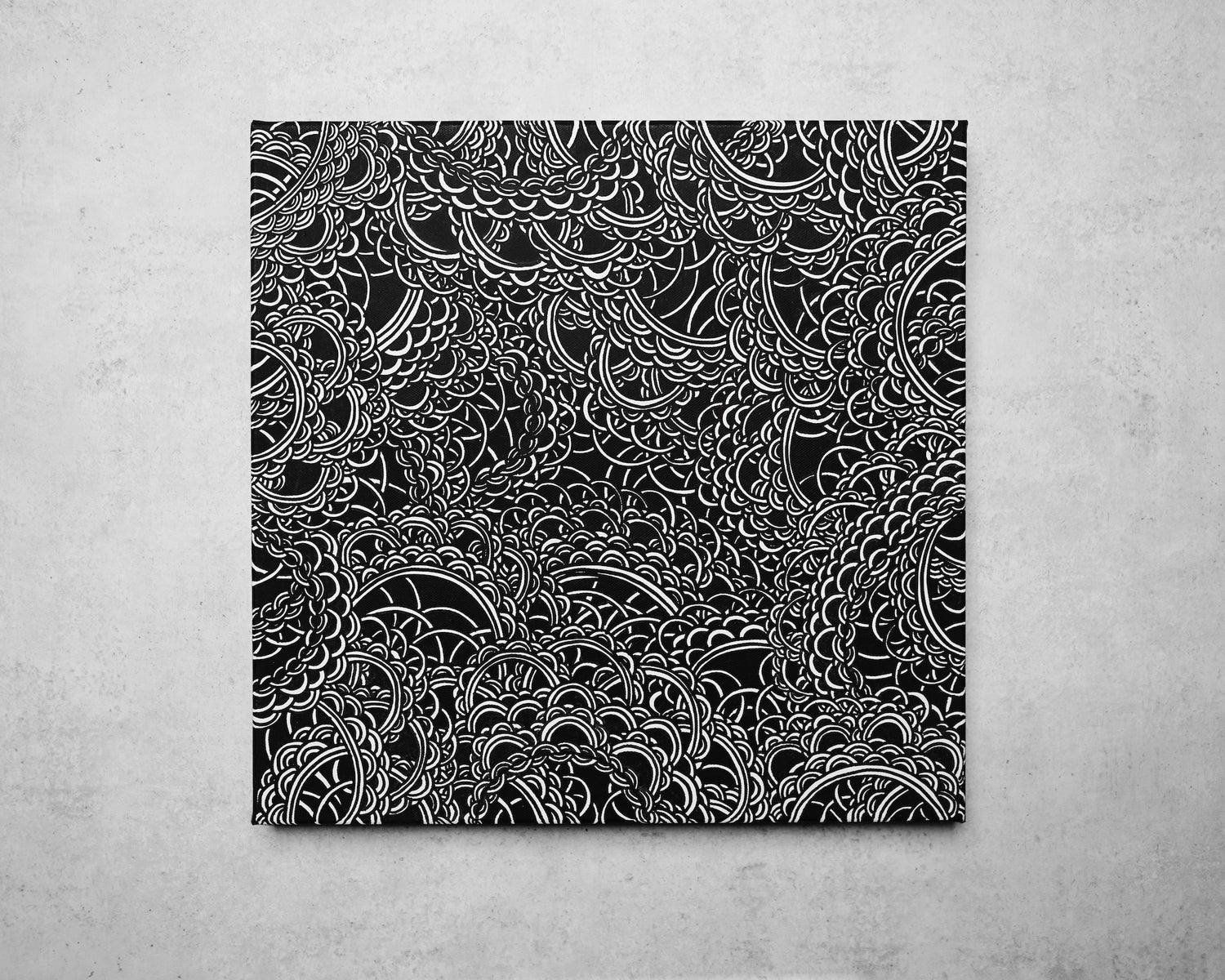 このドローイング作品では、大小さまざまな半円状の曲線が何度も繰り返し描き重ねられています。その様子は細胞の増殖やDNAのコピー&ペーストのようです。さらに、手描きゆえに生じる偏差(ずれ)が線のかたちに影響を与えることによって、同じ形の線でも作品ごとに違った全体像へと導かれてゆきます。この制作過程それ自体が、生物の生命活動を模倣しているのです。生きとし生けるものに対するシンプルな驚きと憧れに突き動かされて、この作品が誕生しました。