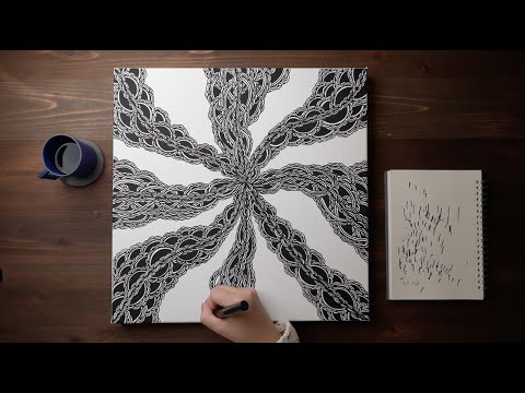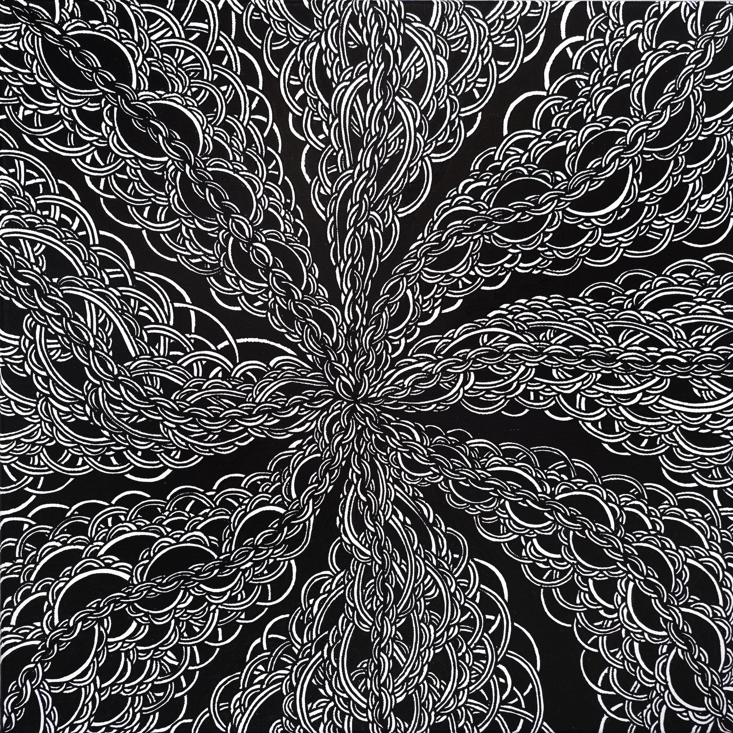 このドローイング作品では、大小さまざまな半円状の曲線が何度も繰り返し描き重ねられています。その様子は細胞の増殖やDNAのコピー&ペーストのようです。さらに、手描きゆえに生じる偏差(ずれ)が線のかたちに影響を与えることによって、同じ形の線でも作品ごとに違った全体像へと導かれてゆきます。この制作過程それ自体が、生物の生命活動を模倣しているのです。生きとし生けるものに対するシンプルな驚きと憧れに突き動かされて、この作品が誕生しました。