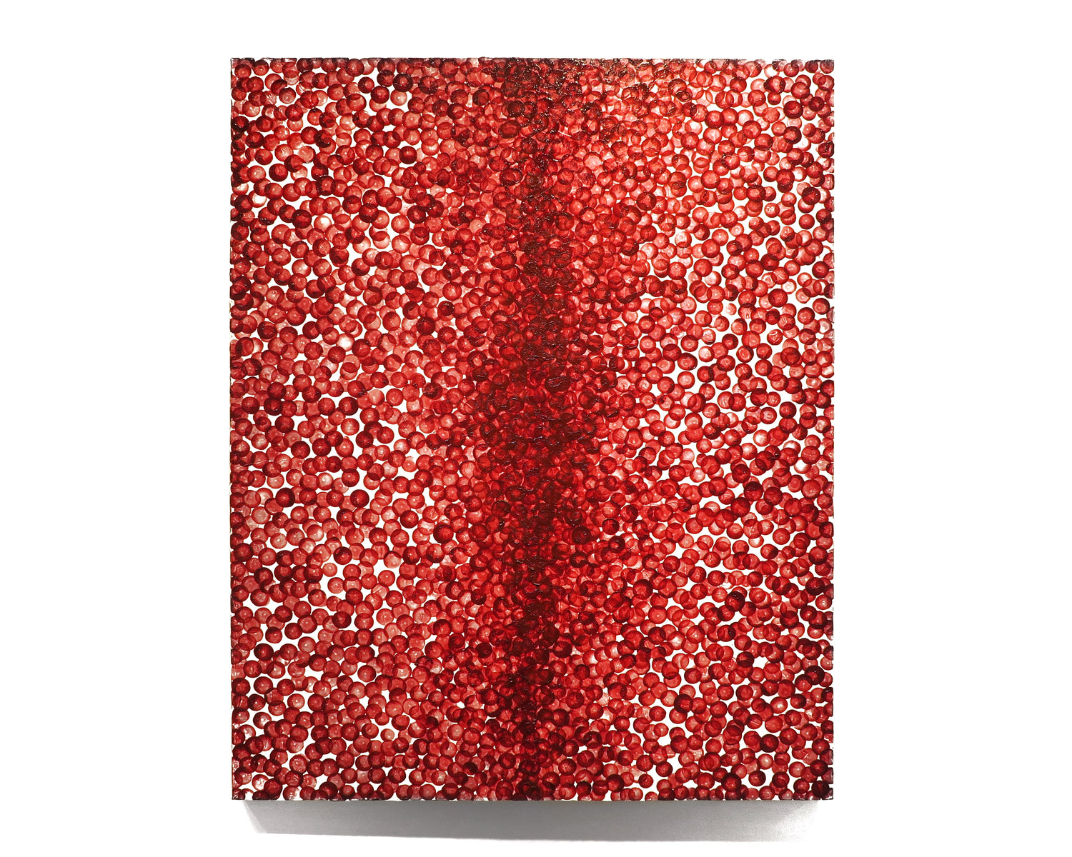 キャンバスの上に踊る、増殖する細胞やうごめく微粒子たち、あるいは宇宙の星々や大規模構造を連想させる、ミクロにもマクロにも感じられる不思議なドット。よく見ると中には血管や植物のような、生命の活動を感じさせる脈の模様が浮かび上がっています。あくまでも抽象的、観念的なドット模様でありながら、しかし踊り狂うような生々しさに満ちたこの作品には、思わず生命のふしぎや奇跡について想いをめぐらせてしまう奇妙な引力があります。