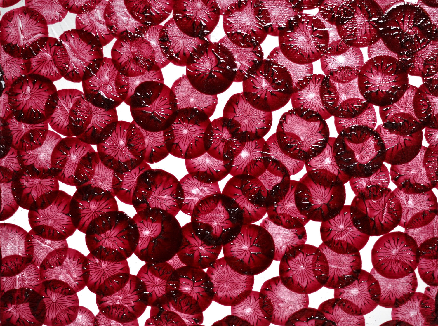 キャンバスの上に踊る、増殖する細胞やうごめく微粒子たち、あるいは宇宙の星々や大規模構造を連想させる、ミクロにもマクロにも感じられる不思議なドット。よく見ると中には血管や植物のような、生命の活動を感じさせる脈の模様が浮かび上がっています。あくまでも抽象的、観念的なドット模様でありながら、しかし踊り狂うような生々しさに満ちたこの作品には、思わず生命のふしぎや奇跡について想いをめぐらせてしまう奇妙な引力があります。
