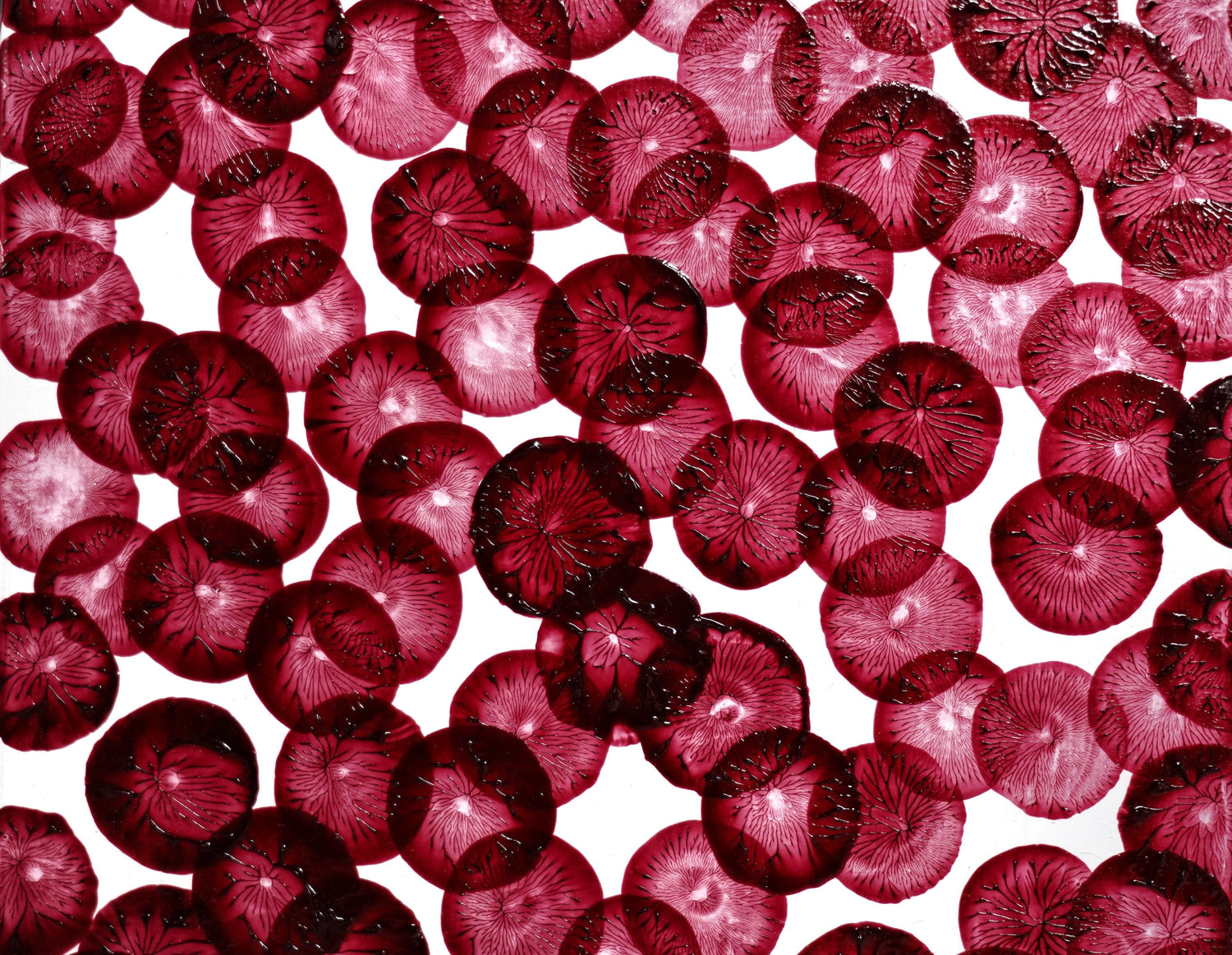 キャンバスの上に踊る、増殖する細胞やうごめく微粒子たち、あるいは宇宙の星々や大規模構造を連想させる、ミクロにもマクロにも感じられる不思議なドット。よく見ると中には血管や植物のような、生命の活動を感じさせる脈の模様が浮かび上がっています。あくまでも抽象的、観念的なドット模様でありながら、しかし踊り狂うような生々しさに満ちたこの作品には、思わず生命のふしぎや奇跡について想いをめぐらせてしまう奇妙な引力があります。