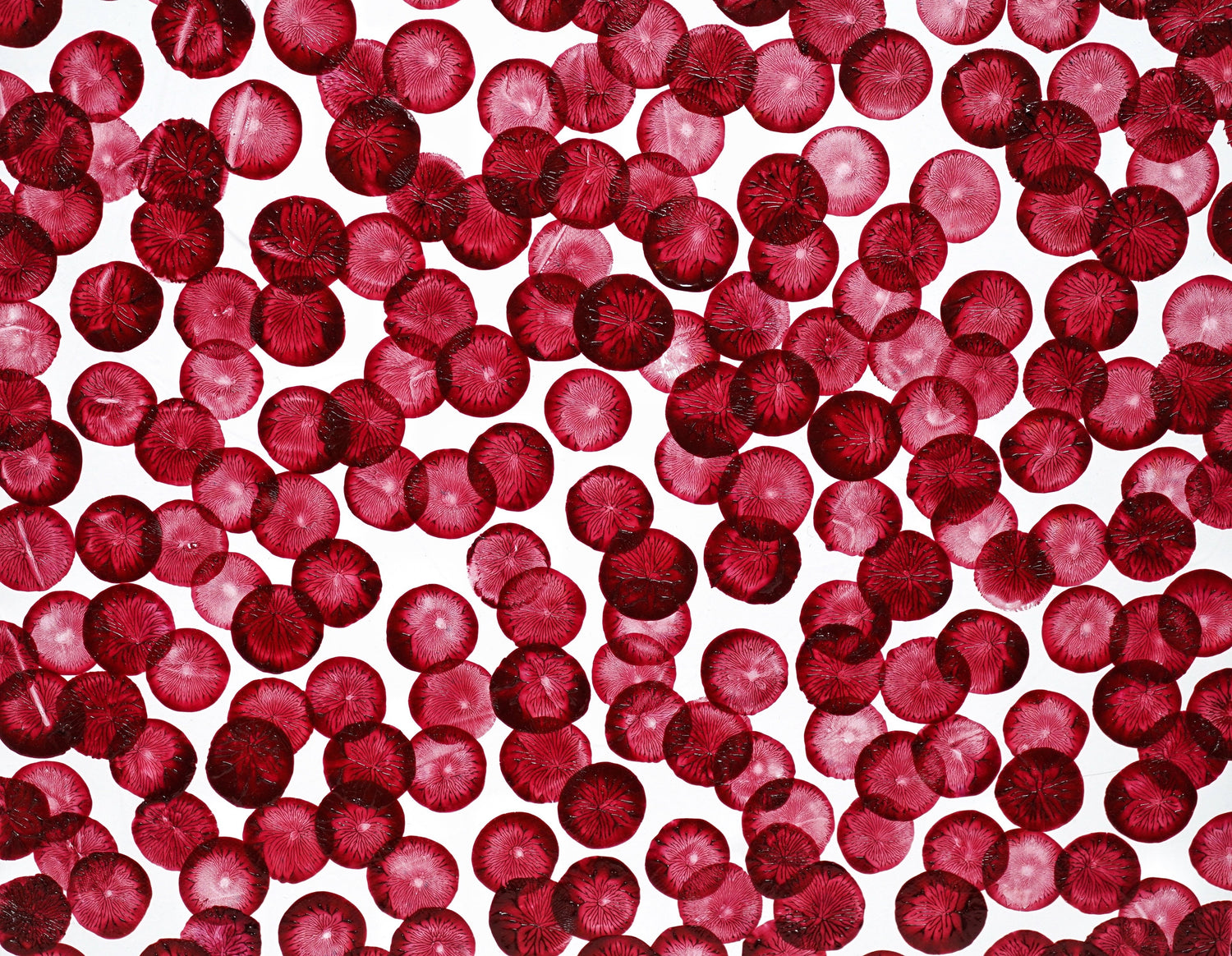 キャンバスの上に踊る、増殖する細胞やうごめく微粒子たち、あるいは宇宙の星々や大規模構造を連想させる、ミクロにもマクロにも感じられる不思議なドット。よく見ると中には血管や植物のような、生命の活動を感じさせる脈の模様が浮かび上がっています。あくまでも抽象的、観念的なドット模様でありながら、しかし踊り狂うような生々しさに満ちたこの作品には、思わず生命のふしぎや奇跡について想いをめぐらせてしまう奇妙な引力があります。