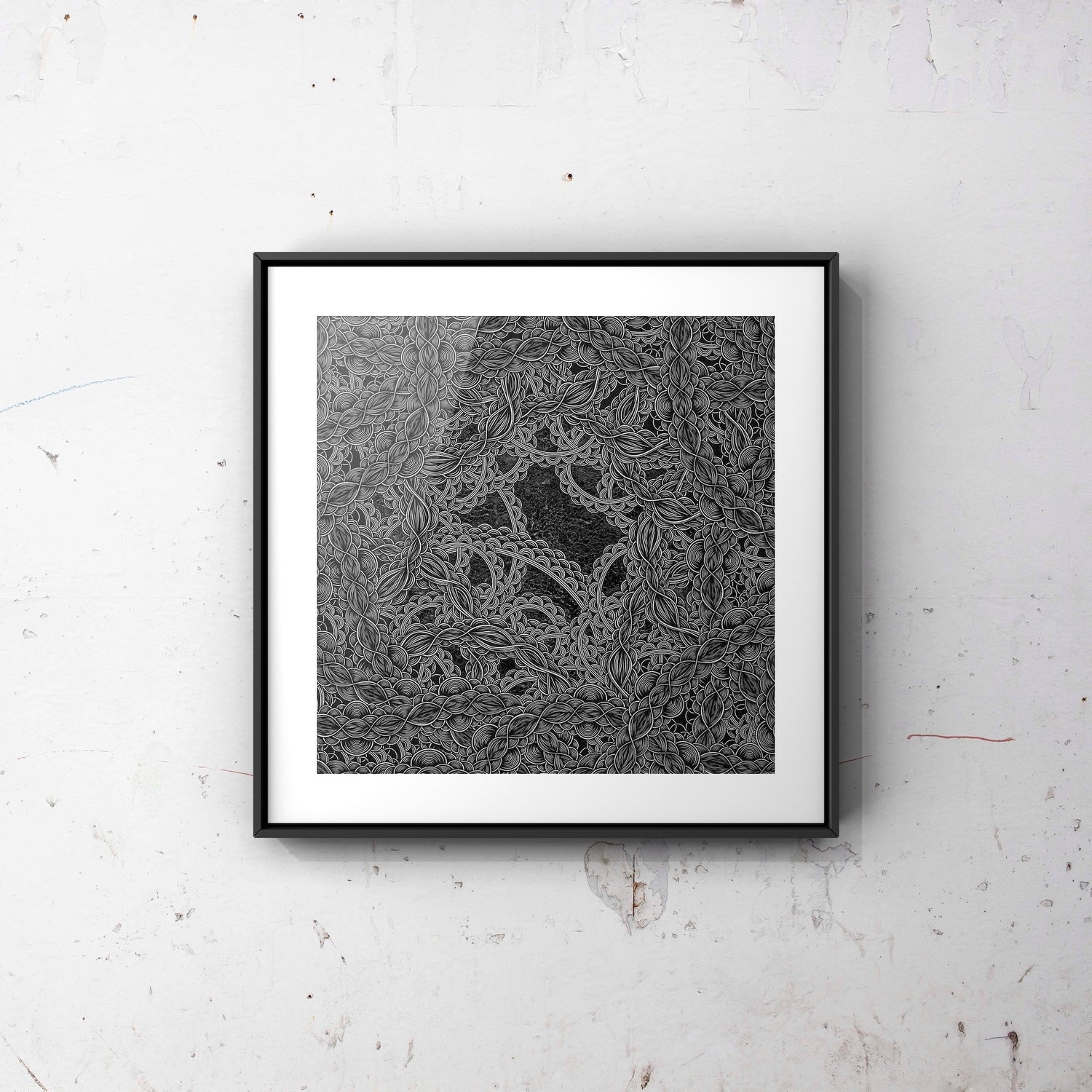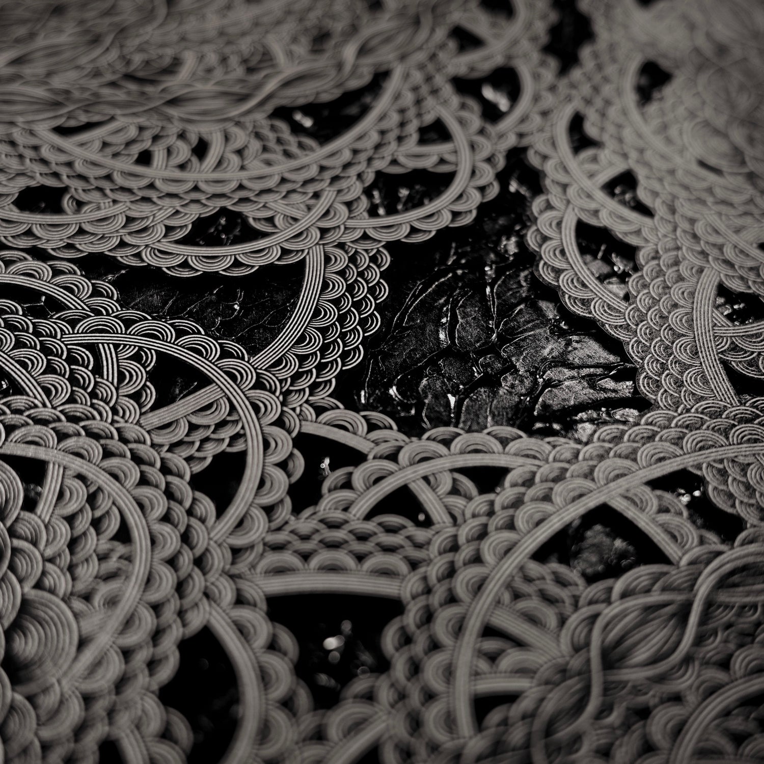 レースや絡まる糸にも見える、フラクタル状の線で構成された平面的な第1層目。