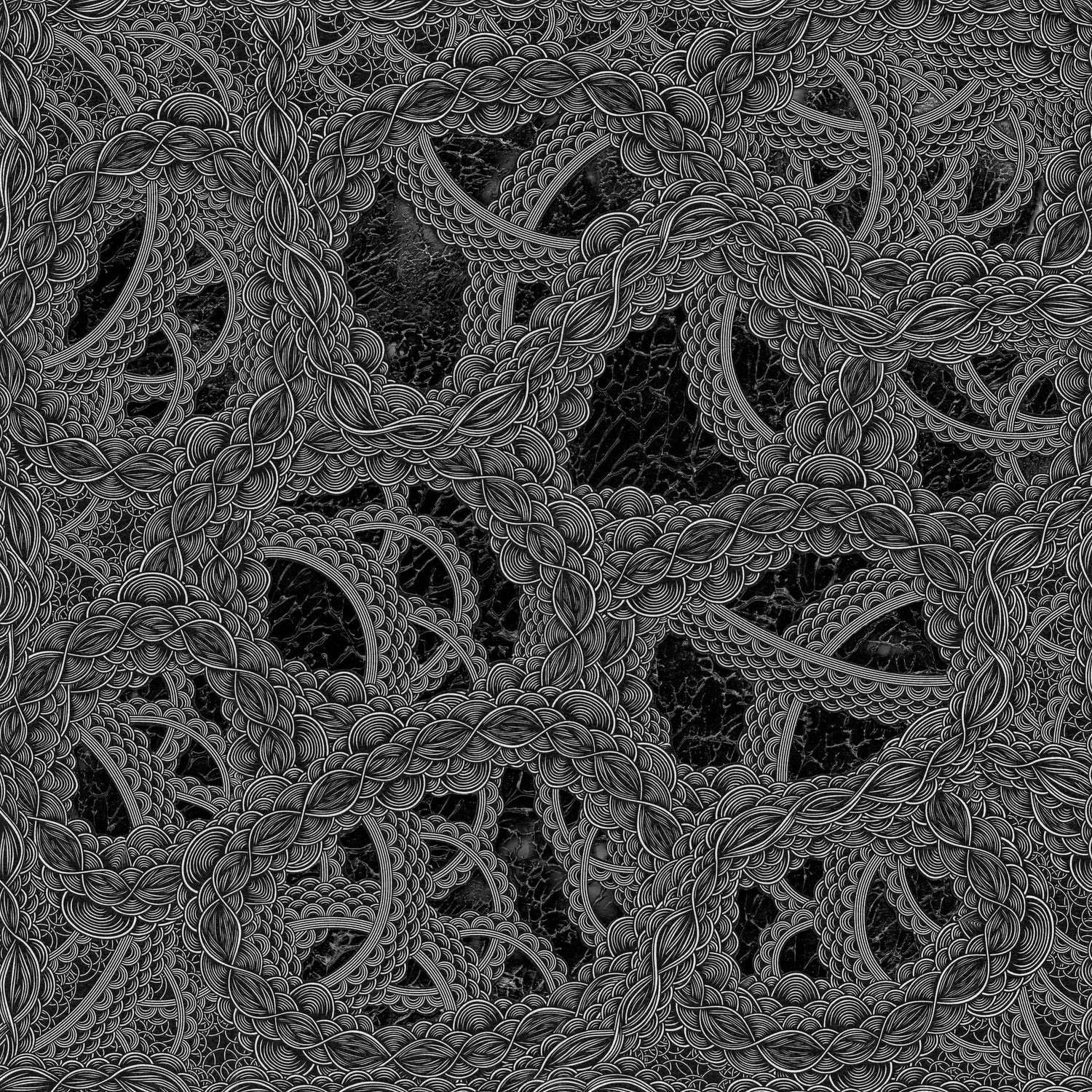レースや絡まる糸にも見える、フラクタル状の線で構成された平面的な第1層目。