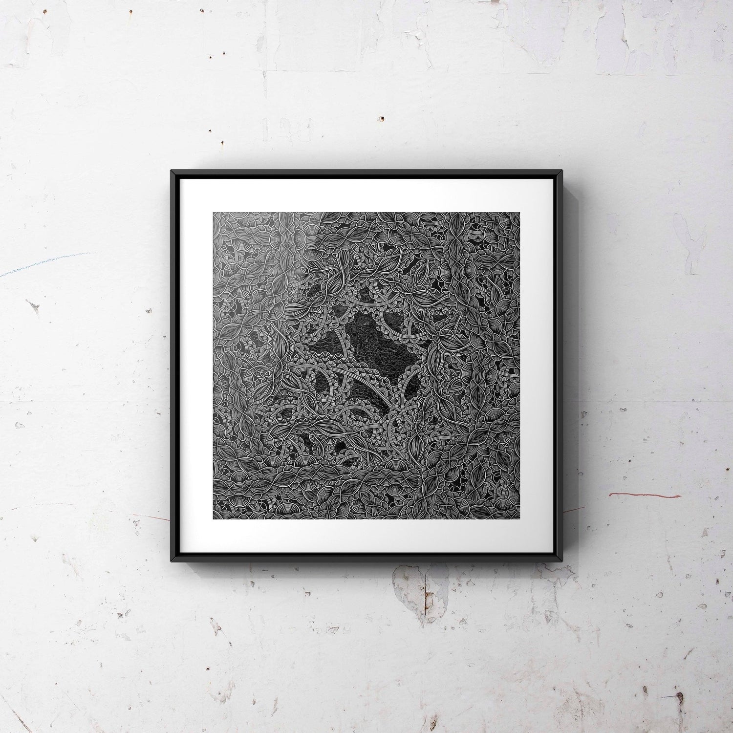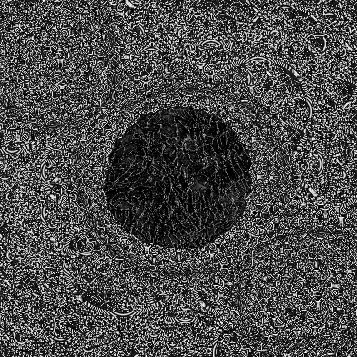 レースや絡まる糸にも見える、フラクタル状の線で構成された平面的な第1層目。